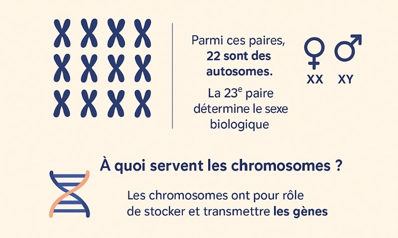 L’être humain possède 46 chromosomes, répartis en 23 paires. Parmi ces paires, 22 sont des autosomes, c’est-à-dire des chromosomes non liés au sexe. La 23ᵉ paire, quant à elle, détermine le sexe biologique :